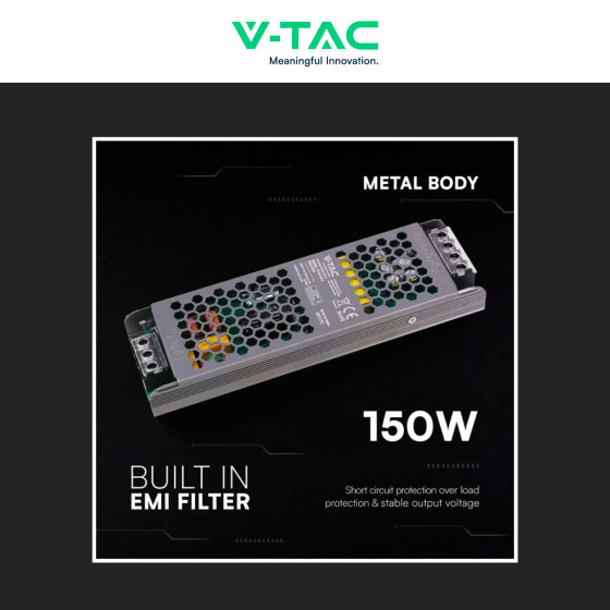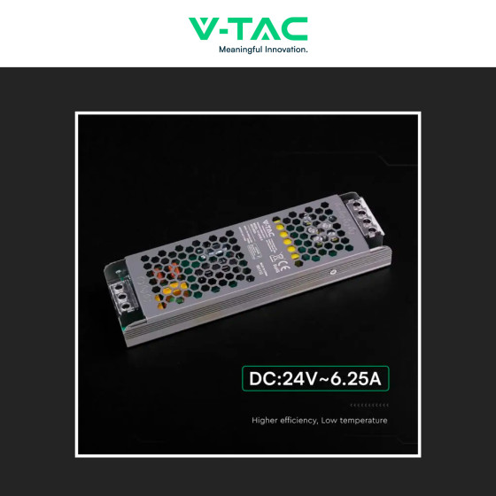 Alimentatore da 24V con potenza di 150W. Corpo in metallo. 1 uscita. Input: AC 176-264V 50/60Hz. Output: DC 24V 6,25A. Connessione con morsetti a vite. Compatibile con strisce LED. Con protezione da cortocircuito, sovraccarico e sovratensione. Filtro EMI integrato. Dimensioni: 209x63x25mm.