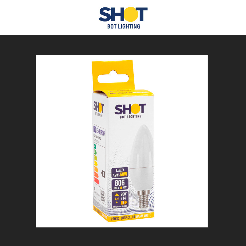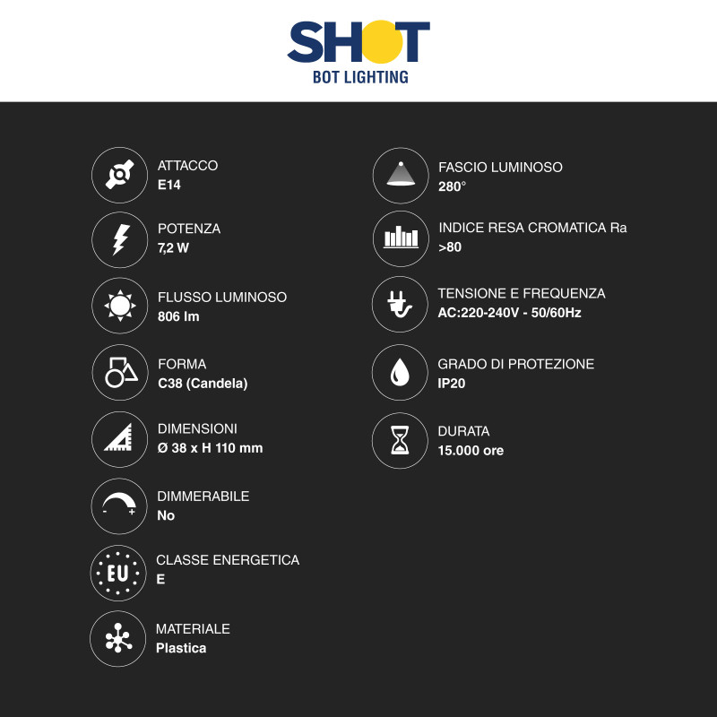 Lampadina LED SMD con attacco E14 e potenza di 7,2W. Forma a candela C38 in materiale termoplastico e copertura opaca. Fascio luminoso di 280°, flusso luminoso di 806 lm e alta luminosità con rapporto di 111 lm/W. Disponibile con: Luce Bianca Calda 2700K, Naturale 4000K e Fredda 6500K. Classe energetica E e resa cromatica >80. Dimensioni: Ø38x110mm.