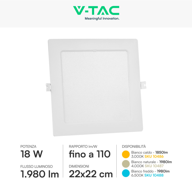 Mini pannello LED SMD con potenza di 18W. Forma quadrata in materiale plastico di colore bianco e copertura opaca. Fascio luminoso di 360° e flusso luminoso fino a 1980 lm con alta luminosità e rapporto fino a 110 lm/W. Installazione ad incasso. Disponibile con: Luce Bianca Calda 3000K (1850 lm, classe energetica F), Naturale 4000K (1980 lm, classe energetica E) e Fredda 6500K (1980 lm, classe energetica E). Resa cromatica >80. Driver incluso. Dimensioni: 220,4x220,4x28,8mm. Dimensioni incasso: 150~155mm.