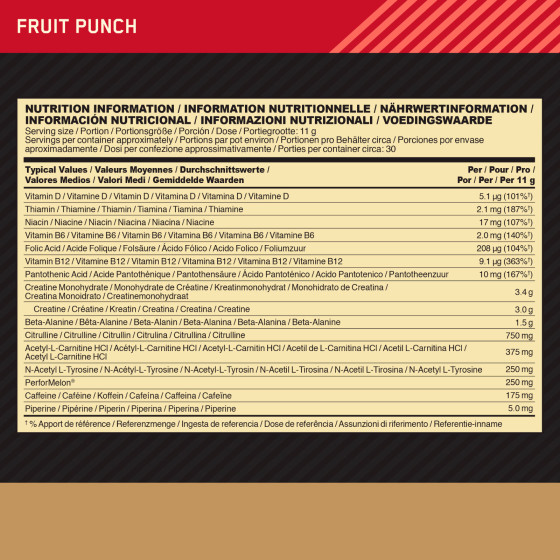 COMPOSIZIONE • Ogni porzione di Gold Standard Pre-Workout (1 misurino - 11g) contiene 175mg di caffeina, 3,4g di creatina monoidrato e beta alanina che aiutano a mantenere la giusta concentrazione e a migliorare la performance. Sono stati aggiunti anche vitamina B6, vitamina B12, vitamina B1, niacina e acido pantotenico a sostegno del normale metabolismo energetico. Infine la formula include anche il nuovo ingrediente PerformMelon Boost, un estratto di anguria, per ottenere il massimo dall'allenamento. • Ogni porzione di Gold Standard 100% Whey (1 misurino - 32g) contiene 24g di proteine che aiutano le fibre muscolari a svilupparsi, 5,1g di BCAA aminoacidi essenziali a supporto della resistenza muscolare e glutammina. Il prodotto è senza glutine e con ridotte quantità di zucchero e grassi. • Ogni porzione di Micronised Creatine (1 misurino - 3,4g) contiene 3g di creatina, aminoacido fondamentale che favorisce il corretto funzionamento muscolare durante gli sforzi brevi e intensi, donando immediata energia.