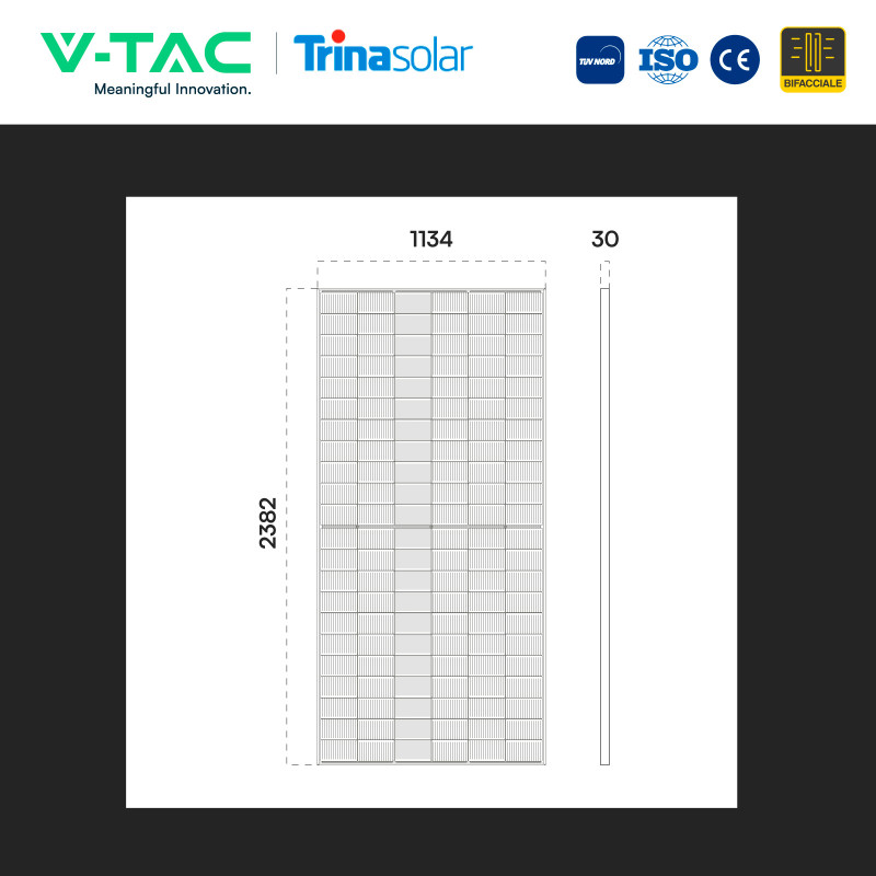 V-Tac pannello fotovoltaico performante anche con scarsa luminosità e dotato di un sistema di autoriduzione del calore che previene la perdita di energia. Oltre all'elevata potenza di 610W STC / 641W BNPI di picco, questo modulo solare è caratterizzato dalla tecnologia TOPCon che garantisce un'alta efficienza nella produzione di energia. Il modulo è costituito da 132 celle bifacciali monocristalline racchiuse in un telaio di alluminio anodizzato e risulta ideale per applicazioni esterne grazie al suo grado di protezione IP68. SPECIFICHE TECNICHE GARANZIA DISPONIBILITÀ |