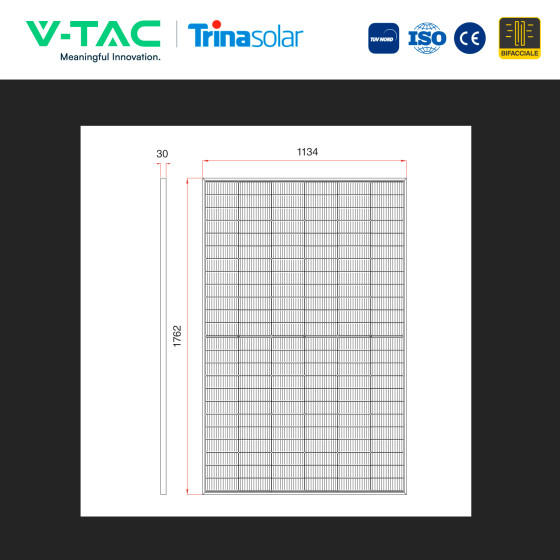 Pannello solare fotovoltaico da 455W STC / 493W BNPI di picco con tensione massima di 44,3 (sia STC che BNPI) e corrente massima di 10,05A STC - 11,13 A BNPI. Costituito da 144 celle di tipo bifacciale monocristallino. Elevata efficienza TOPCon: 22,30%. Grado di protezione: IP68. Telaio di alluminio anodizzato. TIER 1. Garanzia prodotto 25 anni e garanzia producibilità 30 anni. Dimensioni: 1762x1134x30 mm. Peso: 21Kg. Bancale: 36 pannelli (16,02kW).