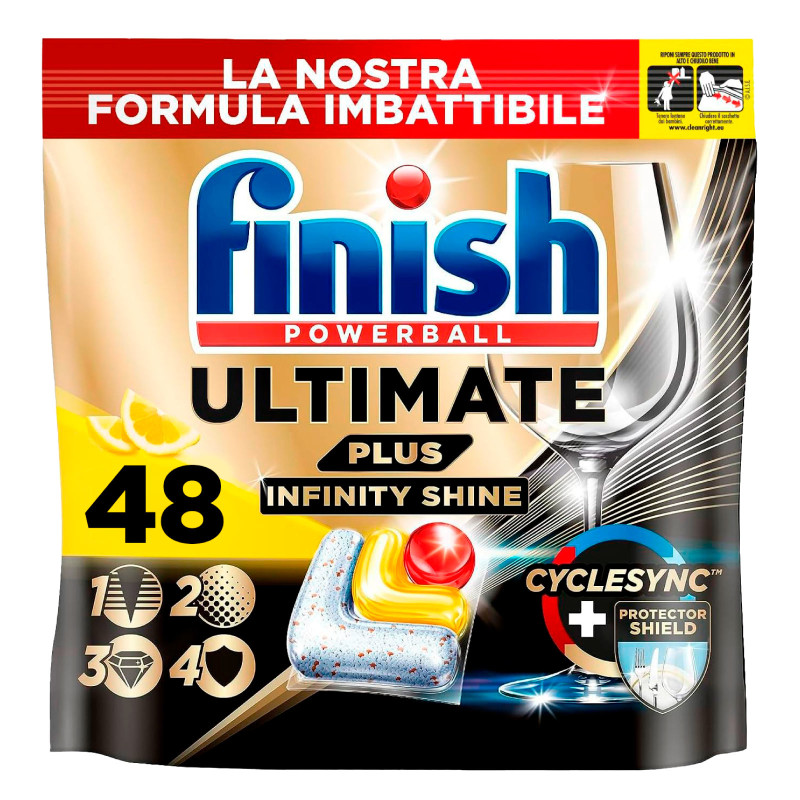 Finish Powerball Utilmate Plus Infinity Shine Detersivo in pastiglie biodegradabili per lavastoviglie con Tecnologia Cyclesync in grado di rilasciare l’ingrediente giusto al momento giusto. E con Funzione Protector Shield con scudo protettivo per protegge bicchieri e posate, mantenendo la lucentezza lavaggio dopo lavaggio. FORMULA MODALITÀ D’USO FORMATO