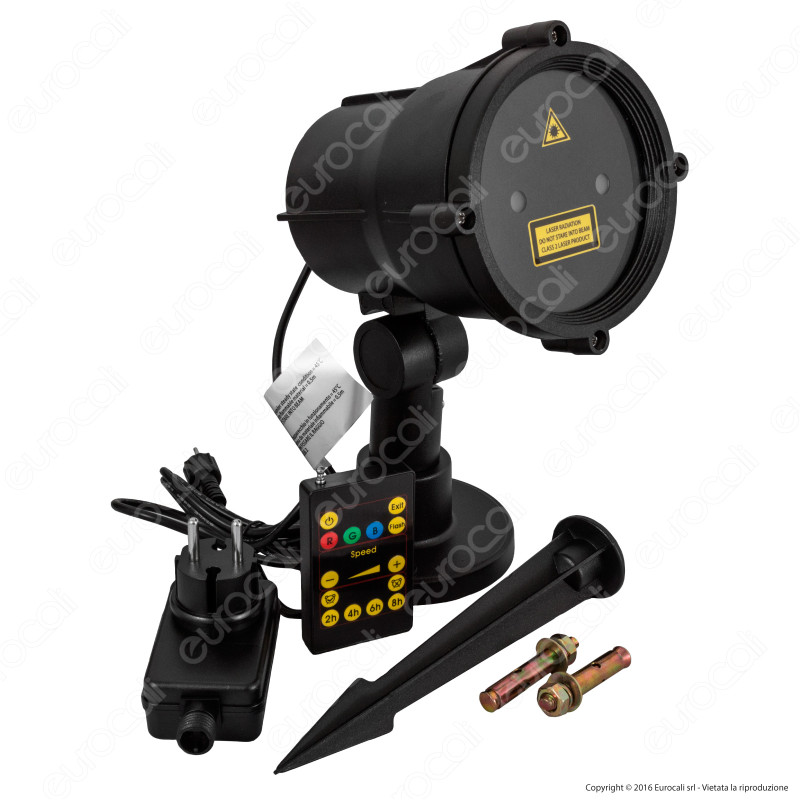 Proiettore laser blu e rosso da giardino con picchetto, base d'appoggio e telecomando. Giochi automatici e timer di accensione selezionabile. Lunghezza cavo alimentazione: 1,5m. Dimensioni proiettore: 40x16cm.