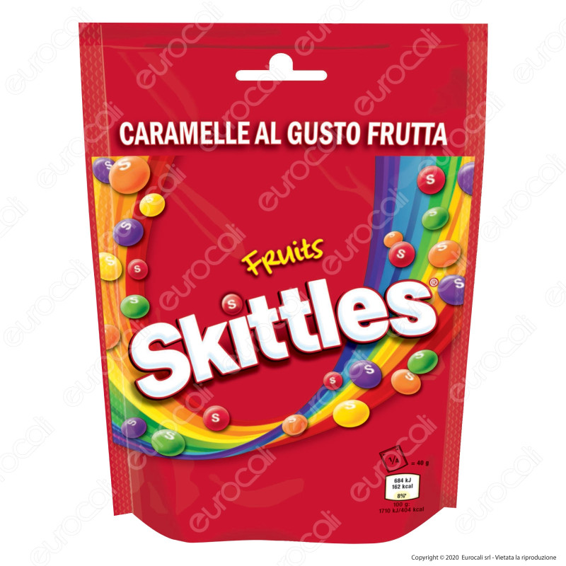Skittles Fruits caramelle alla frutta mista. Confezione singola in busta da 160g. Le inconfondibili e inimitabili caramelle a forma di bottone con la lettera "s" impressa. Riceverai una busta singola di Skittles Fruits da 160g. |