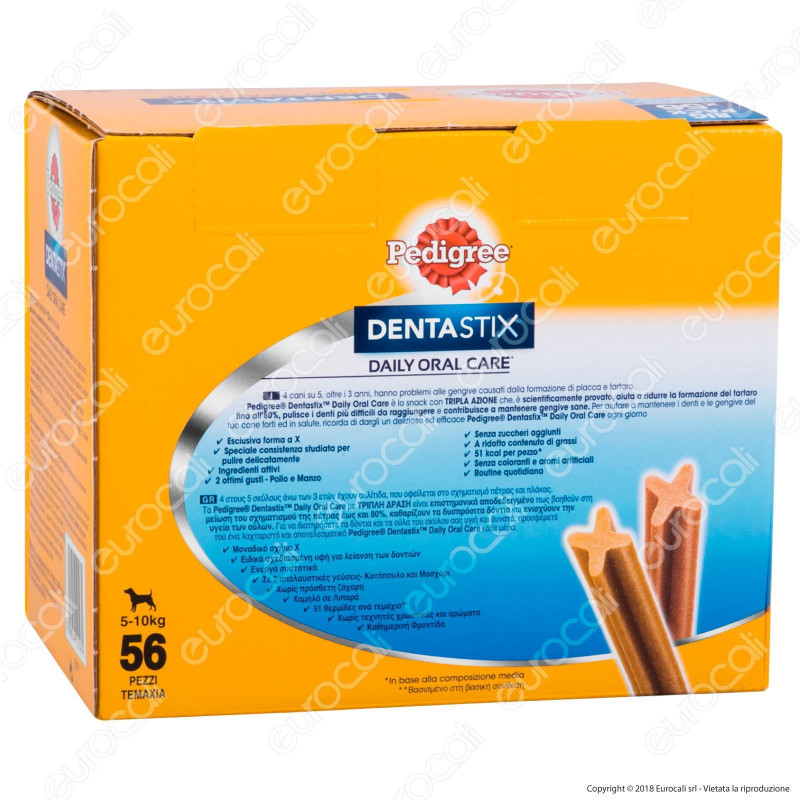 Stick per l'igiene orale del cane. Valore energetico a bastoncino 51 Kcal. A ridotto contenuto di grassi, senza aggiunta di zuccheri, coloranti e aromi artificiali. Adatto a cani di piccola taglia: 5-10kg. Confezione da 56 stick.