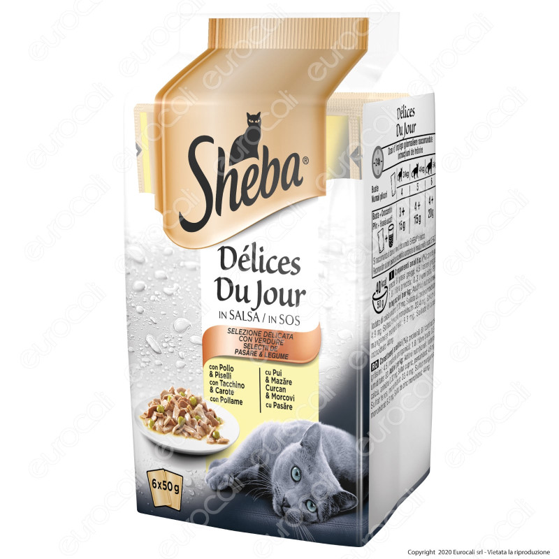 Sheba Delices Du Jour Selezione Deliziosa è un cibo umido adatto a qualsiasi tipo di gatto. Alimento a base di succulenti pezzetti di pollo e piselli, tacchino e carote e pollame serviti con una abbondante salsa. Ricco di vitamine e minerali per il benessere del proprio gatto. Questi appetitosi bocconcini hanno ottimi valori nutrizionali ed un apporto energetico di 45 Kcal/50g, che li rendono un pasto molto salutare. Somministrazione giornaliera: Questi bocconcini Sheba donano il giusto apporto energetico e, grazie al loro sapore ricercato, sono una pietanza che i gatti ameranno. Un cibo completo che regala una alimentazione equilibrata, senza dover rinunciare ad un pasto gustoso e di ottima qualità. La confezione contiene 6 bustine da 50g. |