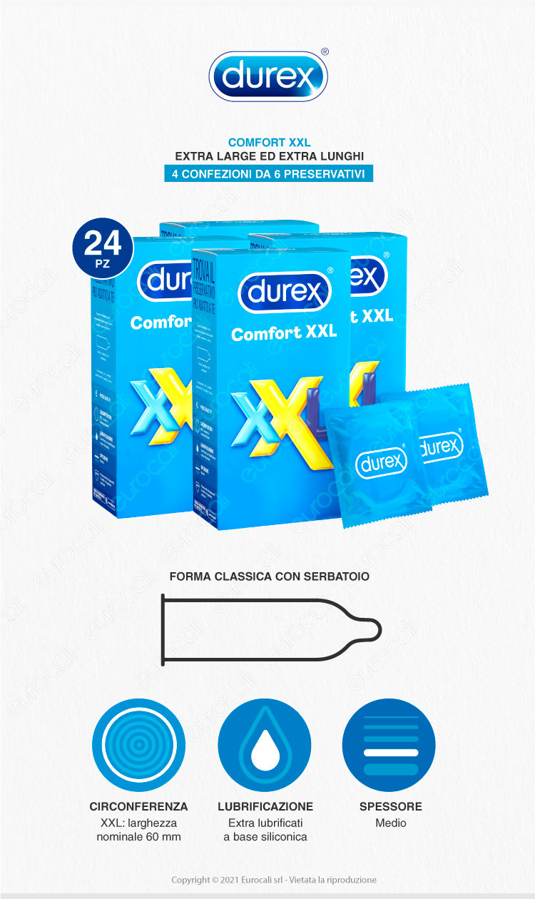 Kit composto da: 4 confezioni di Durex Comfort XXL da 6 profilattici ognuna. 24 preservativi in totale.
