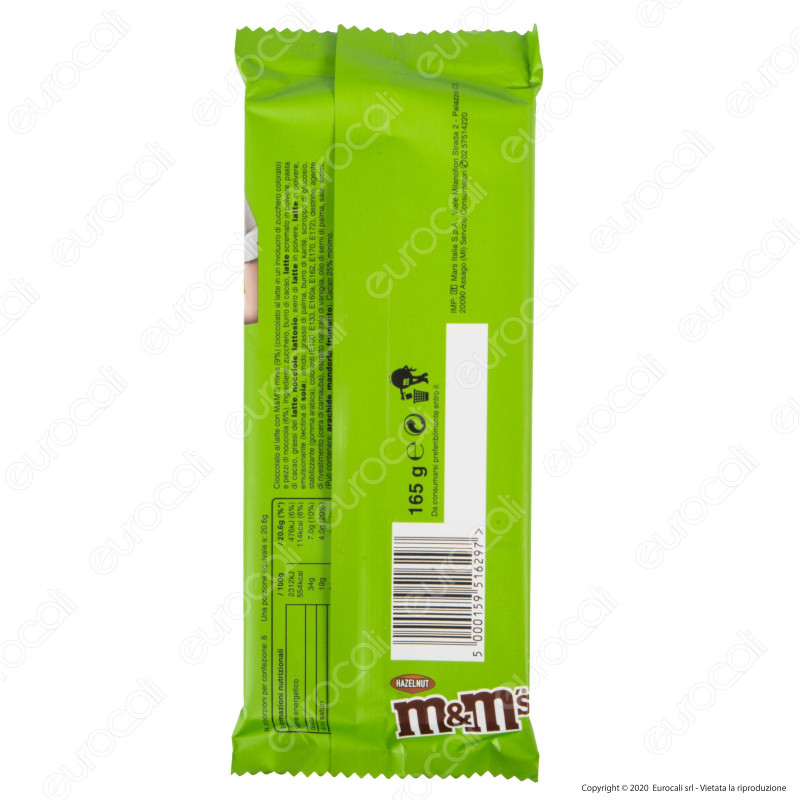Tavoletta di cioccolato al latte ripiena di M&M's alle nocciole, gli inconfondibili confetti con impressa la lettera "m". Confezione da 165g.