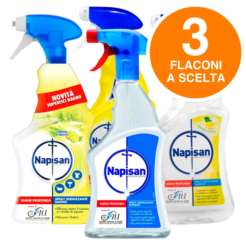 Spray igienizzante a scelta tra Napisan Superfici Classico, Superfici Limone e Menta, Multisuperfici Sgrassante al limone e Bagno Limone e Menta. Kit da 3 flaconi da 750ml ognuno.