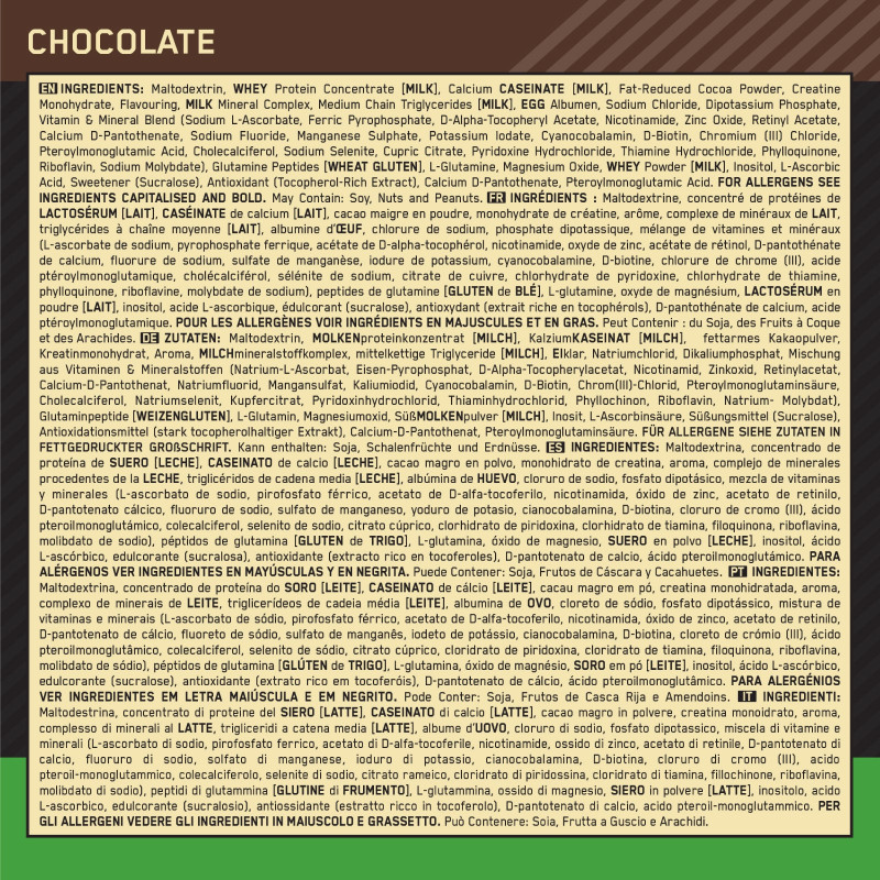 Optimum Nutrition Serious Mass Gusto Cioccolato, integratore calorico per sportivi, a base di proteine derivate dal siero del latte. Ottimo per favorire l'aumento di peso e sostenere la crescita di massa muscolare. Ogni porzione (2 misurini - 334g) contiene 1263Kcal, 50g di proteine, 251g di carboidrati, 3g di creatina, glutammina e 24 vitamine e minerali. Il prodotto non contiene zuccheri aggiunti e ha meno di 5g di grassi per porzioni. L'ideale per sostenere allenamenti intensi e la definizione muscolare. Modalità d'uso: Barattolo da 2,73kg 8 porzioni totali, con misurino e shaker. |