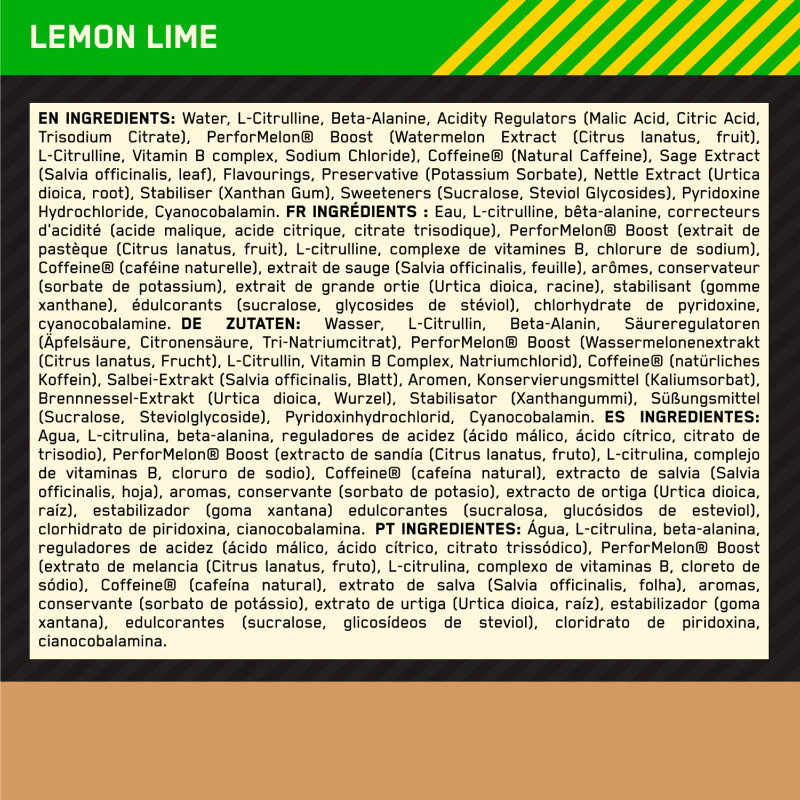 Caffeina e aminoacidi pre-allenamento. Gold Standard Pre-Workout (1 misurino - 11g) contiene 175g di caffeina e 3,4g di creatina. Barattolo da 330g, 30 porzioni totali. Energy Shot monoporzione contiene 175mg di caffeina e 1,5g di beta-alanina. 12 monoporzioni da 60ml.