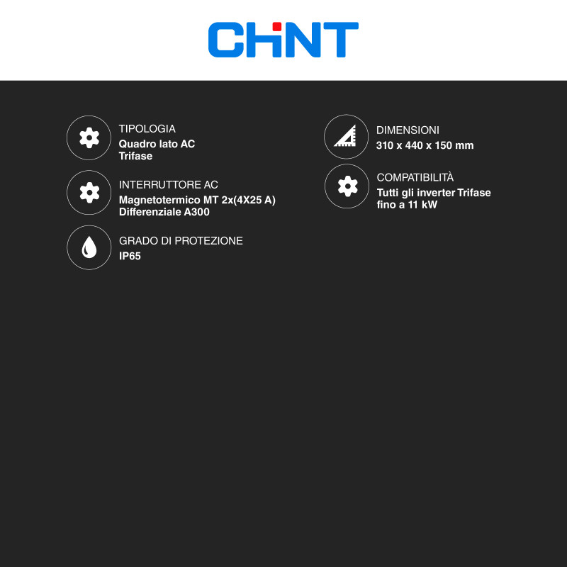 Quadro elettrico lato AC da 11,08kW per impianti fotovoltaici. Tensione Massima: 400Vac. Interruttore AC: Magnetotermico MT 2x (4x 25A) differenziale A300. Grado di protezione IP65. Compatibile con inverter trifase. Dimensioni: 310x440x150mm.