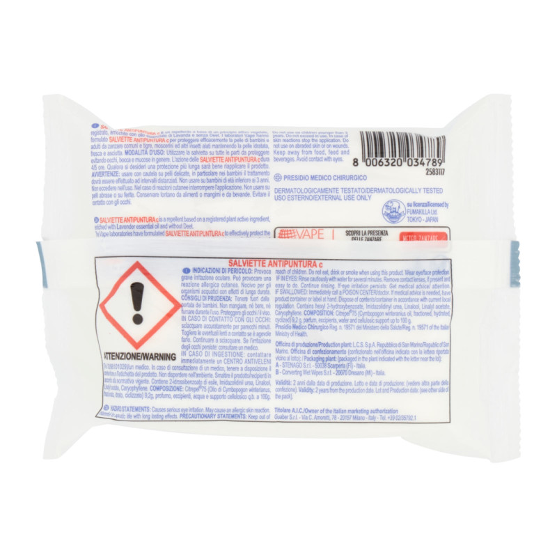 Salviette Antizanzare per il corpo. Proteggono dalle punture di zanzare comuni, tigre e altri insetti. Al profumo di citronella e eucalipto. Da utilizzare su adulti e bambini sopra ai 3 anni. L'azione dura fino a 4 ore. Presidio Medico Chirurgico. Confezione da 15 salviette.