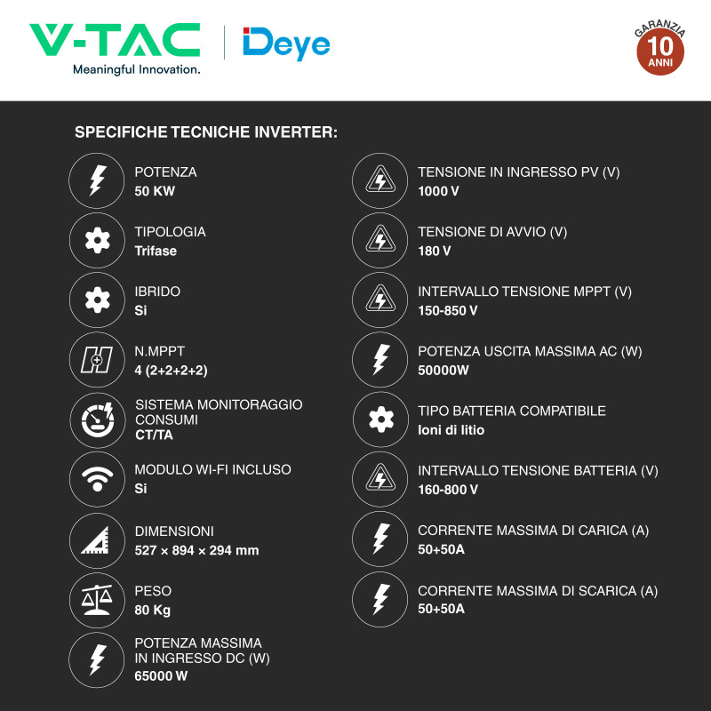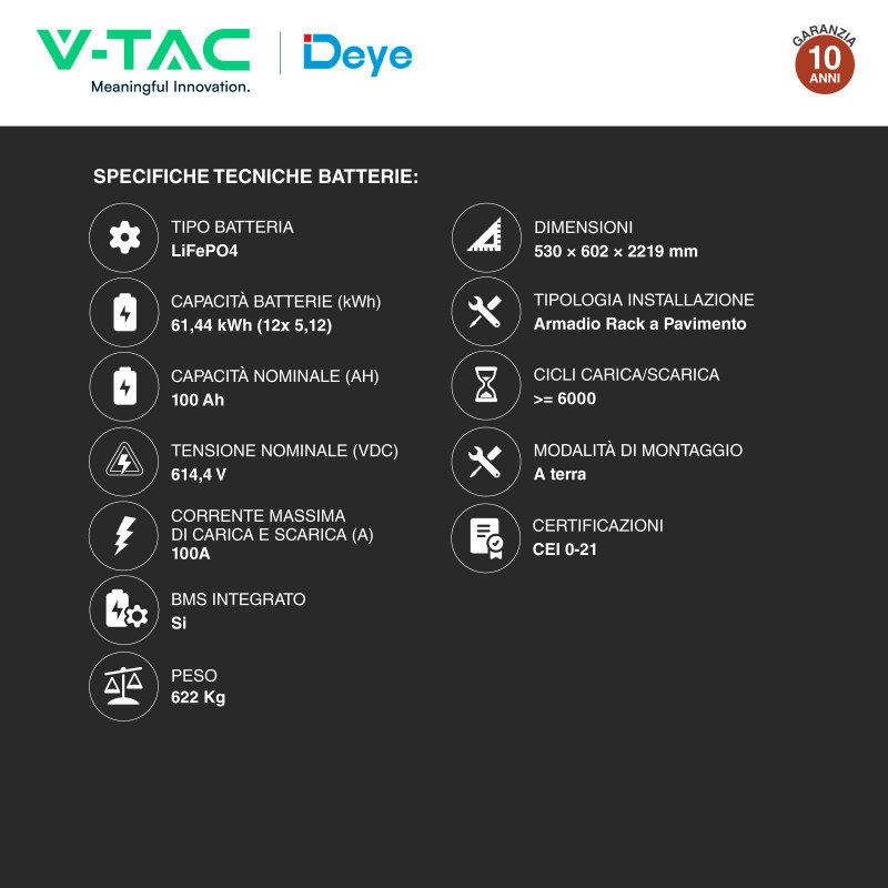 Sistema industriale all-in-one: integra in un'unica soluzione 1 inverter trifase da 50kW con tensione di ingresso 1000V, 1 sistema BMS, 1 armadio rack e 12 accumulatori LiFePO4 con capacità totale di 61,44kWh e tensione nominale di 614,4V. Certificato CEI 0-21. Modulo Wi-Fi incluso, sistema controllabile tramite app. Garanzia 10 anni. Dimensioni inverter: 527x894x294mm. Dimensioni sistema di accumulo: 530x602x2219mm.