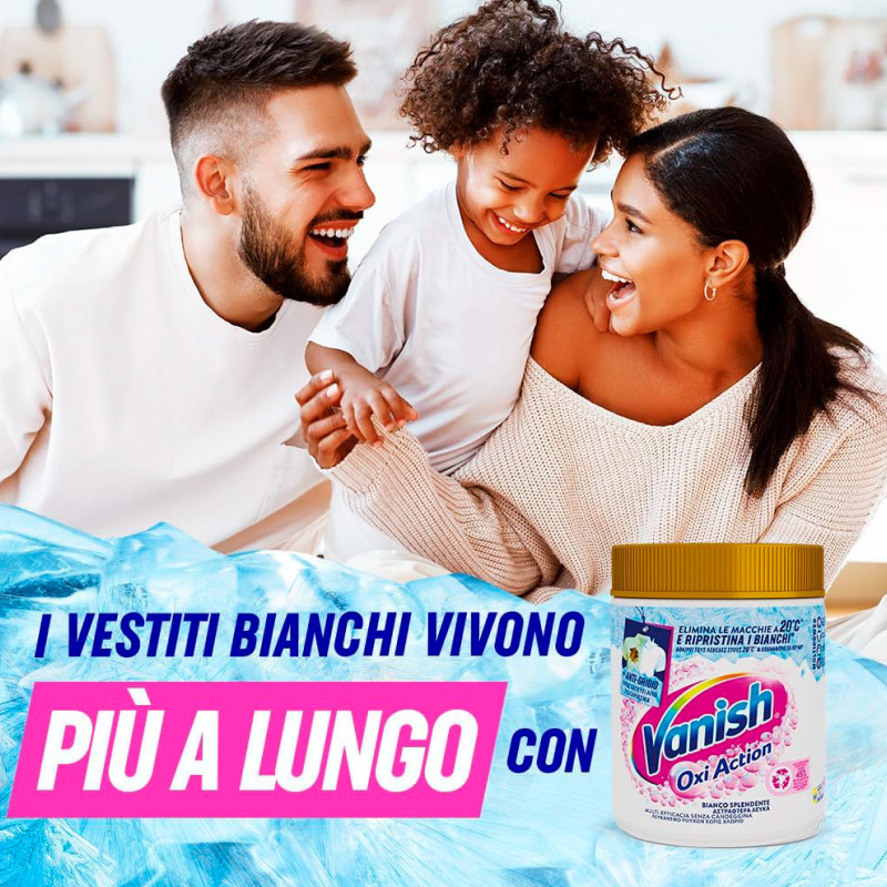 Vanish Oxi Action White smacchiatore in polvere per capi bianchi efficace nei lavaggi a freddo, anche a 20°. Raddoppia la vita dei capi con azione anti-grigio. Igienizza, elimina gli odori e le macchie più ostinate senza l'utilizzo della candeggina. Utilizzabile nel pre-lavaggio, in ammollo e in lavatrice. MODALITÀ D’USO FORMATO
