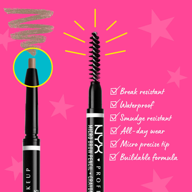 NYX Professional Makeup Micro Brow Pencil matita automatica per sopracciglia con punta sottile che disegna e definisce con precisione ogni singolo pelo. Dotata di scovolino per ammorbidire i contorni e creare un effetto naturale. FORMULA MODALITÀ D'USO COLORAZIONE |