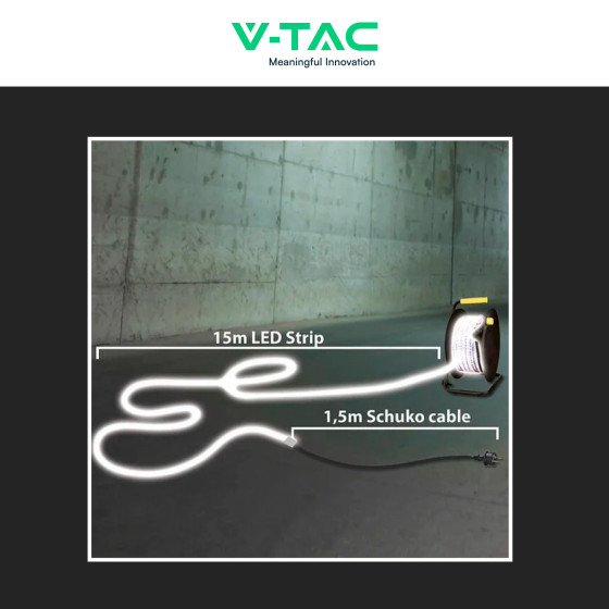 Striscia LED SMD da cantiere avvolgibile con presa Schuko e chip SMD 2835. Lunghezza di 15m, potenza di 12,3 W/m e tensione di 220V. Flusso luminoso di 1282 lm/m e alta luminosità con rapporto 104 lm/W. Classe di isolamento II e prolungabile fino a 50m. Classe energetica F e resa cromatica >90. Disponibile con Luce Bianca Naturale 4000K. Dimensioni: 230x190x310mm.