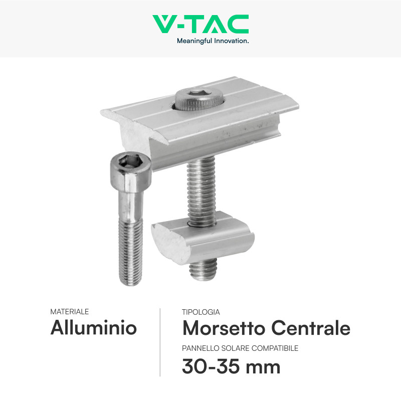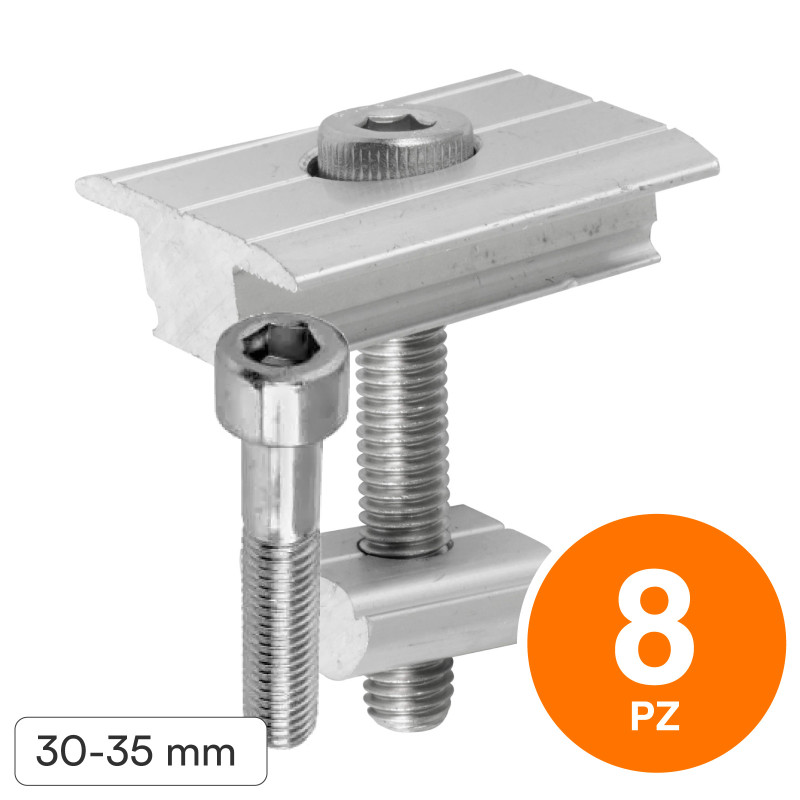Morsetto centrale in metallo per pannelli fotovoltaici da 30mm o 35mm di spessore. Realizzato per il fissaggio dei pannelli solari al binario di installazione. Confezione da 8 pezzi.