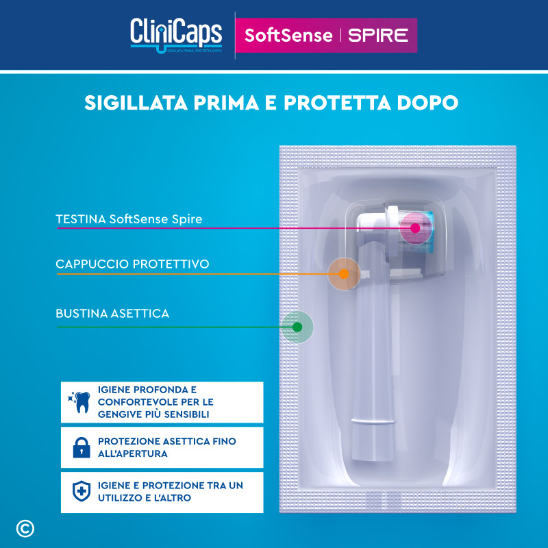 CliniCaps SoftSense Spire testine per spazzolini elettrici di colore bianco compatibili con Oral-B, per una pulizia profonda ma delicata anche sulle gengive più sensibili. Dotate di setole ultra-morbide e avvolgenti che rispettano la sensibilità delle gengive e offrono un comfort totale a ogni spazzolata. Confezionate singolarmente, ideali da portare in viaggio, ufficio, palestra e altri ambienti condivisi e perfette da portare con sé in borsa, zaino o bagagli. CARATTERISTICHE CONTENUTO DELLA CONFEZIONE |