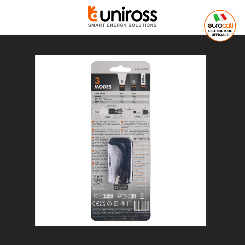 Torcia elettrica con potenza di 5W e tecnologia LED. Realizzata in alluminio ad alta resistenza di colore nero e arancione. Flusso luminoso fino a 300 lm, portata fino a 135m, autonomia fino a 4,5 ore e rapporto fino a 60 lm/W. 3 modalità selezionabili tramite pulsante per regolare flusso luminoso e distanza del fascio luminoso. Grado di protezione IPX4. Dotata di clip da cintura. Funzione SOS e garanzia 5 anni. Batteria 14500 al litio da 3,7V e 600mAh inclusa, sostituibile e ricaricabile in 2 ore. Cavo USB-C da 50cm incluso. Dimensioni: Ø24,5x143,5mm.