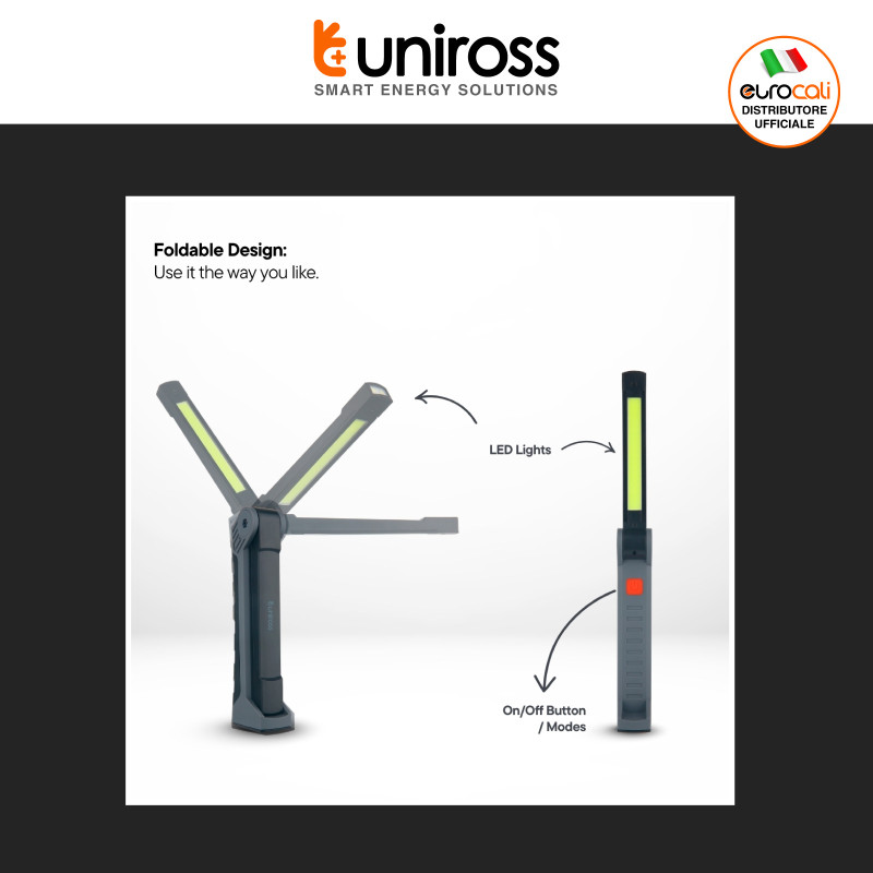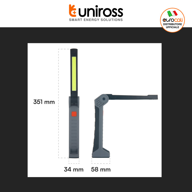 Lampada da lavoro ricaricabile da 2 × 0,5W + 4W con tecnologia LED SMD + COB e flusso luminoso fino a 600 lm. Tre modalità di illuminazione selezionabili (High, COB High, COB Low). Installazione versatile tramite supporto magnetico o gancio integrato. Corpo orientabile con superficie gommata e indicatore di batteria. Batteria Li-ion 18650 da 1200 mAh ricaricabile tramite USB Type-C con autonomia fino a 6 ore. Grado di protezione IP44. Dimensioni: Ø351×58×34mm.