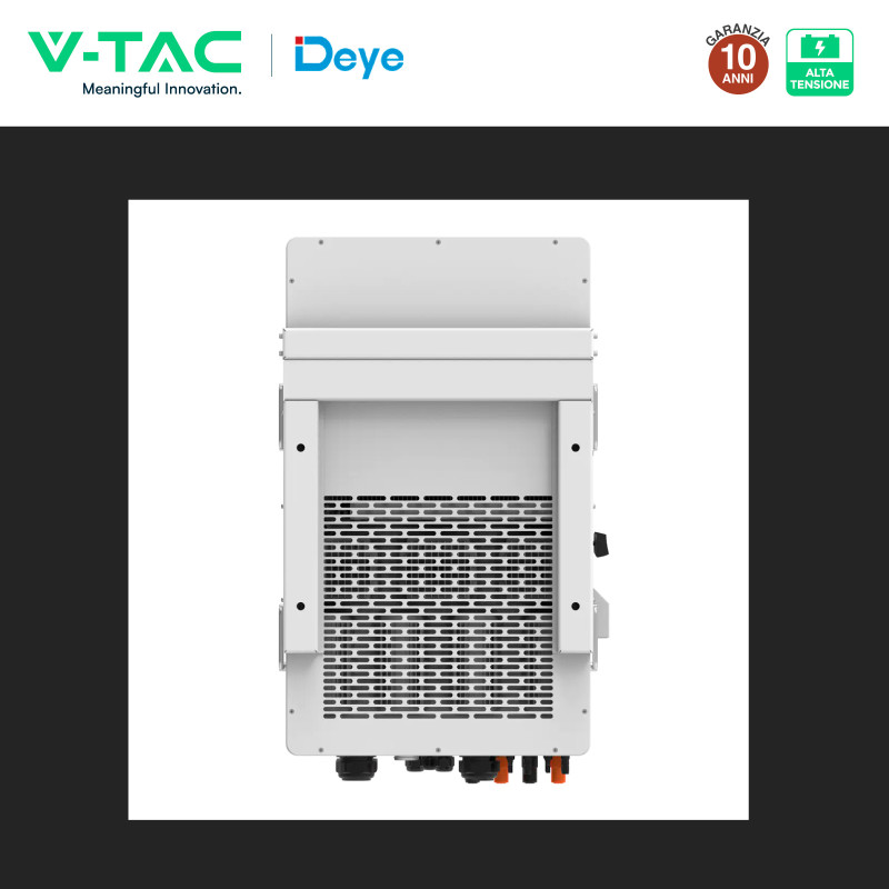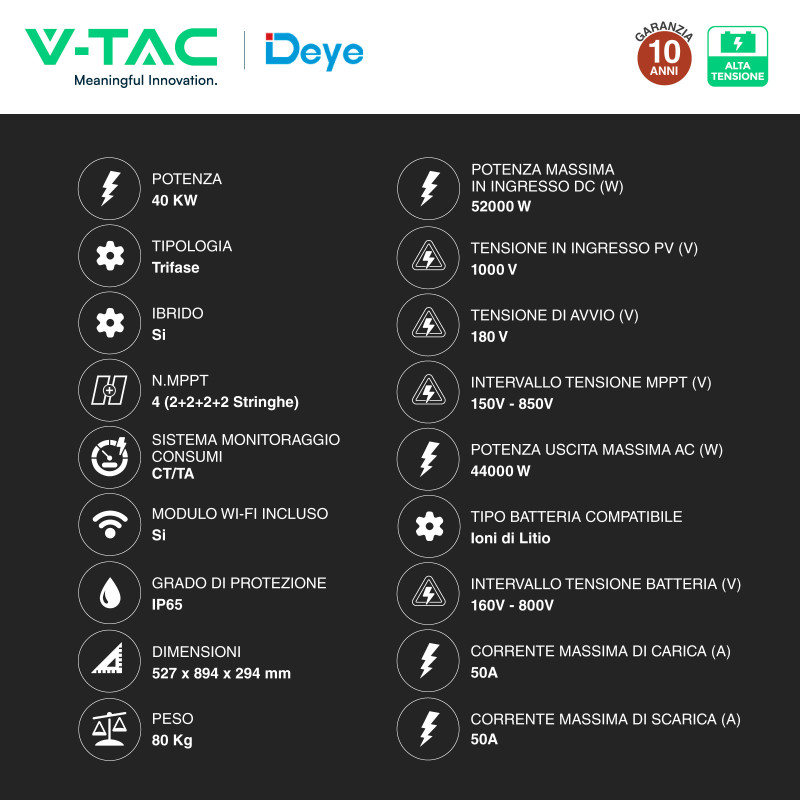 Inverter ibrido On-Grid/Off-Grid per pannelli solari di impianti fotovoltaici industriali. Sistema trifase, potenza di 40kW e tensione in ingresso di 1000V. Potenza max in ingresso (totale pannelli collegabili): 52,0kWp. Predisposto per l'installazione a parete, grado di protezione IP65 per uso esterno. Compatibile con batterie ad alta tensione. Inclusi accessori per l'installazione e modulo Wi-Fi. Certificato CEI 0-21 e CEI 0-16. Garanzia 10 anni. Dimensioni: 527x894x294mm. Peso: 80,0Kg.