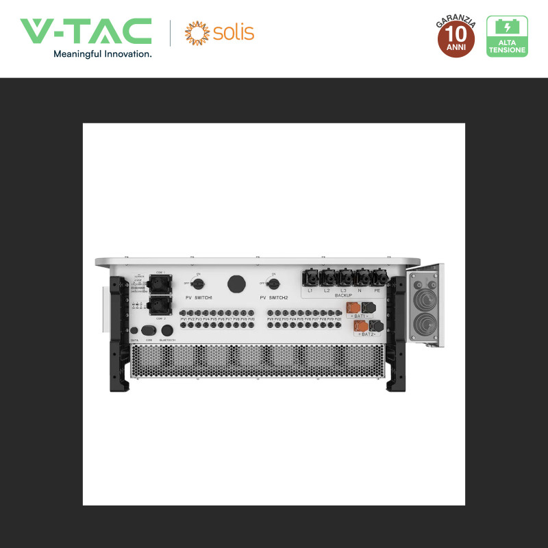 Inverter ibrido On-Grid/Off-Grid per pannelli solari di impianti fotovoltaici industriali. Sistema trifase, potenza di 125kW e tensione in ingresso di 1000V. Potenza max in ingresso (totale pannelli collegabili): 250Wp. Predisposto per l'installazione a parete, grado di protezione IP66 per uso esterno. Compatibile con batterie ad alta tensione. Inclusi accessori per l'installazione e modulo Wi-Fi. Garanzia 10 anni. Dimensioni: 1174×814×400mm. Peso: 170kg.