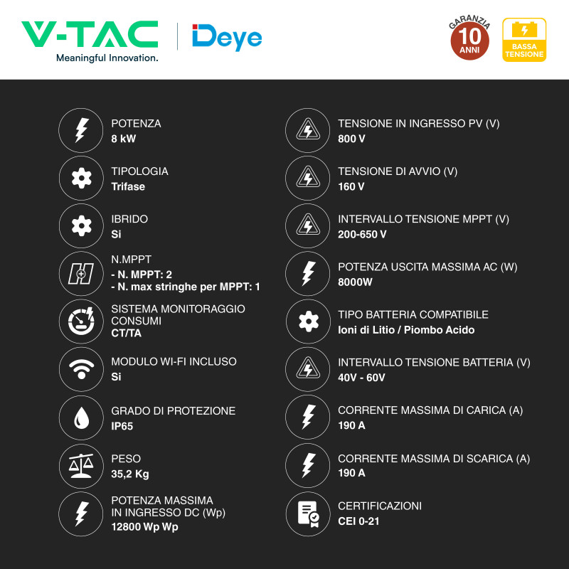 V-Tac Deye Inverter Trifase Ibrido On-Grid / Off-Grid 8kW IP65 Garanzia 10 Anni CEI 0-21 Display LCD - SKU 12643