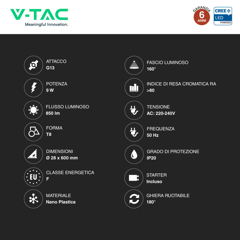Tubo LED SMD con chip CREE, attacco G13 e potenza di 9W. Forma T8 in Nano Plastic e copertura opaca. Fascio luminoso di 160°, flusso luminoso di 850 lm e rapporto di 94 lm/W. Ghiera ruotabile di 180°. Dummy starter incluso. Disponibile con: Luce Bianca Calda 3000K, Naturale 4000K e Fredda 6500K. Classe energetica F e resa cromatica >80. Garanzia: 6 anni. Dimensioni: Ø28x600mm.
