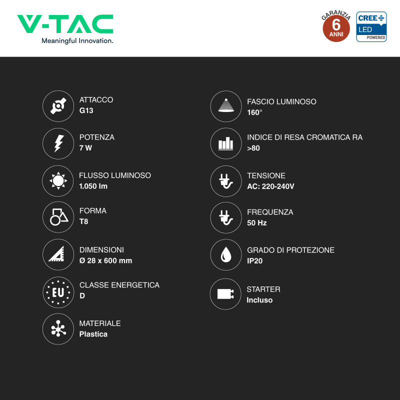 V-Tac VT-007 Tubo LED T8 G13 7W SMD Chip CREE Nano Plastic Lampadina 60cm con Starter - SKU 240646 / 240656