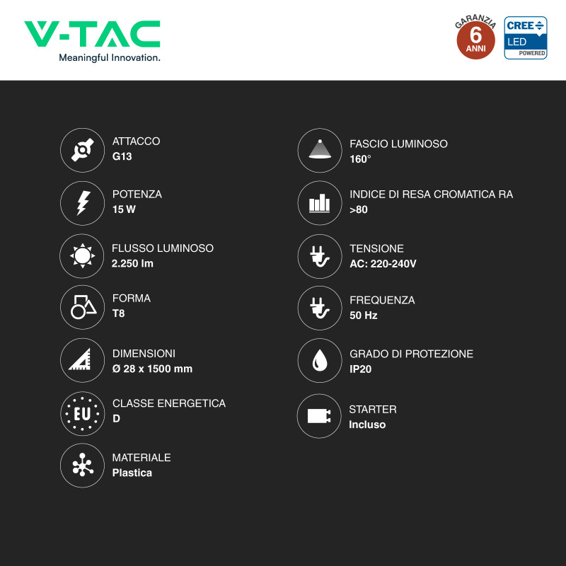 SPECIFICHE TECNICHE • Forma: Tubo T8 • Attacco: G13 • Potenza: 15W • Tecnologia: LED CREE SMD • Tensione: AC 220-240V • Frequenza: 50 Hz • Fascio luminoso: 160° • Flusso luminoso: 2250 lm • Efficienza luminosa: 150 lm/W • Classe efficienza energetica: D • Materiale: Nano Plastic • Colore: Bianco • Copertura: Opaca • Ra: >80 • Dimensioni: Ø 28 x 1500 mm • Durata: 25.000 ore • Garanzia: 6 anni • Starter incluso