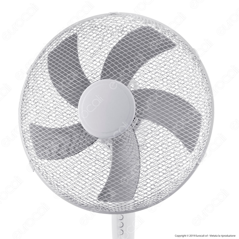 Ventilatore a piantana con 5 pale a sciabola. Diametro 40cm. Potenza 45W. Oscillazione orizzontale. Struttura in ABS. 3 velocità di ventilazione.
